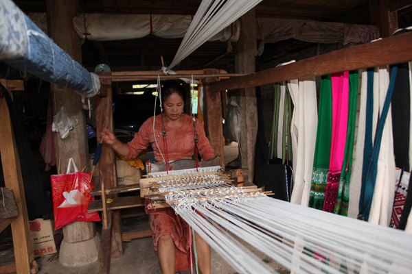 傣錦具有嚴格的制作工序。第一道工序為上漿。傣錦所選用的材料為天然麻棉,上漿可以讓麻棉線的韌性加強,不會起毛,這一步對以后織傣錦的過程有非常重要的影響。先將麻棉用專門調(diào)制好的米漿浸泡一天兩夜,再放到蒸籠蒸,蒸的時侯要注意不斷小心地翻動,以保證米漿完全均勻地浸入棉紗,令到棉線的粗細一致。第二步是曬棉紗。即把蒸好的棉紗放在太陽底下暴曬,在曬的過程中需要由專人隨時檢查,把結(jié)在一起的棉紗一根根分開來,這樣在紡線的時侯棉線才不會因為線粘在一起而斷掉。最后把曬好的線繞成線團。第三步是拉經(jīng)線。拉經(jīng)線也是傣族織錦中非常重要的一道工序。在拉線的時候,所需要的場地非常大,因為線一拉一般都有八九十米長,為保持所有的線在拉的時候不會亂掉,只能在沒有太大的風的天氣才能進行,讓整個傣錦制作過程又增加了難度。在拉經(jīng)線的整個過程,都必須由有經(jīng)驗的老藝人來組織,打樁,計算經(jīng)線的長度,而且必須控制好在拉經(jīng)線的過程中棉線的松緊度。否則在織傣錦的時侯會有花紋傾斜,圖案錯亂等問題。整個拉經(jīng)線的過程需要由7-8個老藝人一起來完成。第四步是編花和上機。傣錦是一種古老的手工紡織工藝,圖案的設(shè)計是通過熟練的紡織技巧創(chuàng)造出來的,多是單色面,用緯線起花,對花紋的組織非常嚴謹,織造時傣族婦女將花紋用一根根細繩系在“紋板”(花木)上,用腳蹬手抬的動作使經(jīng)緯形成上下兩層后開始投緯,如此反復(fù)循環(huán)便可織成十分漂亮的傣錦。設(shè)計一幅傣錦,需幾百乃至上千根細繩在“紋板”上表現(xiàn)出來,倘若結(jié)錯一根細線,就會使整幅傣錦圖案錯亂,可見傣錦的工藝要求極高。