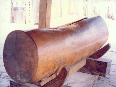 過去,佤族凡新建一個村寨,就要先找水源定寨址,再拉木鼓蓋木鼓房。佤族認為木鼓是天神莫偉的床,木鼓房是莫偉的家,只有拉了木鼓,請莫偉天神進寨保佑、才能建房立寨,拉木鼓的日子一般在佤歷一月,即公歷10月進行。是時,先由寨子派出有經(jīng)驗的老人3—5人進山選擇樹木,將選定的樹木每棵劈一點樹皮回來,由魔巴殺雞卜卦,哪棵的卦好就確定為做木鼓的樹,而后由魔巴率領(lǐng)青壯年男子進山將樹砍倒,斷出一截做木鼓用。全寨男女老少盛裝艷服將木頭拉回,鑿成木鼓,安放于鼓房內(nèi)。拉木鼓的場面極為熱鬧壯觀,人們以能摸一下拉木鼓的繩索為最大的榮耀。木頭拉到寨外要舉行隆重的剽牛祭神儀式才能將木頭拉進寨內(nèi)。木鼓有公母之分,公木鼓用紅毛樹,母木鼓用麻公樹。鼓長1.5-2米,鼓身直徑70—100厘米,一般是扁形和方形。洞深40-50厘米,洞口寬4-5厘米,長1.2-1.4米。洞呈瓜瓢形。背端多有牛頭形浮雕。由于所用本質(zhì)不同,公木鼓發(fā)音高亢清亮,母木鼓沉渾悠揚,響聲遙遠。過去,只有逢村寨大事或械斗或集會議事,或祭祀鬼神,或告急友鄰才能敲響木鼓,平時是不能隨便敲的。由于佤族歷史上有獵人頭祭祀木鼓的習(xí)俗,村寨部落間經(jīng)常發(fā)生血族復(fù)仇的械斗。隨著獵頭陋習(xí)的革除,木鼓已從原始祟拜的氛圍中擺脫出來,成了人們喜愛的敲擊樂器,佤族編創(chuàng)了自娛自樂的木鼓舞。