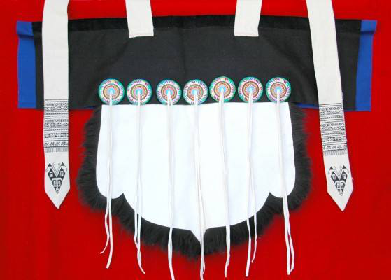七星披肩所用材料為黑色綿羊皮,先將羊皮去毛、洗凈、硝白、縫成披肩,然后在披肩背上繡上自己縫制精美的七顆星星,每個星星中心垂下兩條布帶,整個布帶與白色寬帶相繞,帶梢端垂于后,披肩的兩角釘上兩條白布帶,勞動時拉到胸前交叉系緊。”這樣一件精美的“披星戴月衣”是對勤勞的納西族婦女的歌頌,形如蛙身狀的披肩是古代納西族圖騰崇拜的標(biāo)志,在納西族傳統(tǒng)中,青蛙是智慧之神,反映了納西族在美學(xué)、習(xí)俗等方面形成的傳統(tǒng)觀念和心理特征。