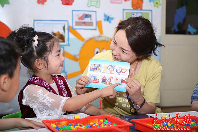 有一年春季,古麗孜娜提剛從外地學(xué)習(xí)回來(lái),就接手了一個(gè)新班。這個(gè)班的幼兒大多來(lái)自農(nóng)村,在常規(guī)習(xí)慣、自理能力、適應(yīng)性、語(yǔ)言發(fā)展等方面都較弱。每次上幼兒園都又哭又鬧。古麗孜娜提還未成家,她把孩子們當(dāng)成自己的孩子,耐心地安撫每一個(gè)孩子,走進(jìn)他們的心靈。