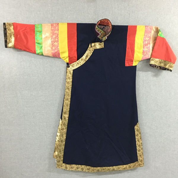 民族文化宮博物館收藏的這件立領(lǐng)右衽大襟五色袖“彩虹衣”,是土族女子盛裝時的一種服飾,征集于青海省互助土族自治縣。年代為20世紀(jì)30年代?!安屎缫隆遍L117厘米,胸圍120厘米,袖長59厘米,棉質(zhì)。整件女服右衽大襟,藍(lán)棉布襯里,左右側(cè)開衩,黑色“拉花”立領(lǐng),領(lǐng)上以土族傳統(tǒng)刺繡工藝—盤繡刺繡紅綠相間圓形圖案和辮形線條,綴三枚金色圓銅扣。衣袖為紅、黃、綠、白、粉五色彩布、彩緞拼接的“彩虹袖”,其中紅色為主色,占整個衣袖約一半面積,其余四色布塊相鄰,均勻分布于衣袖上方,布塊上刺繡有金色梅、蘭、竹、菊圖案。衣袖袖口鑲寬約3厘米黑色絲絨底刺繡花邊,花邊里外均繡有花草紋樣,做工精致?;ㄟ吷辖訉捈s10厘米金色牡丹紋花邊,與襟邊、下擺、衩口等處所貼金色牡丹紋花邊相互呼應(yīng),極富設(shè)計感。