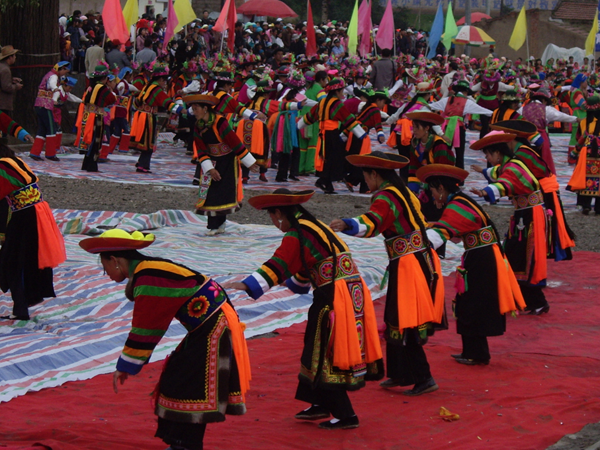 不同地區(qū)的土族舞蹈具有相對(duì)獨(dú)立性,互助的“安昭”、民和的“納頓”、大通的“踏灰”、同仁的“於菟”、甘肅卓尼的“嘎?tīng)枴钡仁亲罹叽淼拿耖g舞蹈。“安昭”,土語(yǔ)稱之為“千佼日”,意為“彎曲”或“轉(zhuǎn)圈”,是土族民間喜慶節(jié)日和婚禮儀式中,用于禮贊祈祝的一種圓場(chǎng)群舞,也是一種歌舞結(jié)合、無(wú)樂(lè)器伴奏的集體舞蹈。一般由男女各半圍成圓圈,由一男子帶領(lǐng),一唱眾和。舞蹈動(dòng)作簡(jiǎn)單質(zhì)樸,舞者兩手由右胯旁起向左上方至右上方劃圓弧,變?yōu)樽笫智谀X前,右手高居于后,似雄鷹翱翔于藍(lán)天?!办遁恕蔽杓椿⑽琛!办遁恕保枪糯藢?duì)虎的方言稱謂。每年農(nóng)歷十一月二十日祭山神時(shí),名為於菟的舞者在赤裸的上身繪制虎豹圖案,模仿虎的形象“前端腿跳”舞蹈,達(dá)到祀神驅(qū)邪、祈求平安的目的。