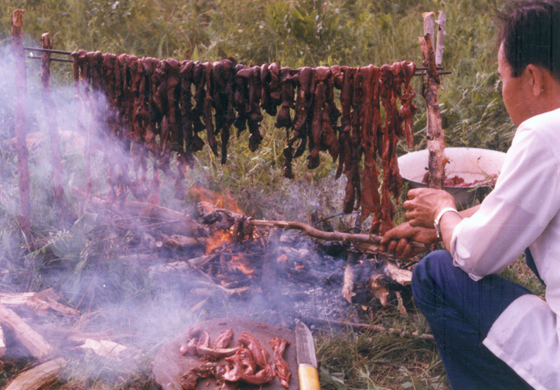 肉食分為家畜家禽和野獸野禽以及魚(yú)類等,吃法有曬、煮、烤等,但是不炒,其中“手把肉”最為著名。布特哈、齊齊哈爾、璦琿等地達(dá)斡爾族因定居普遍養(yǎng)豬,年節(jié)時(shí)宰殺。布特哈地區(qū)因狩獵還占有一定比重,肉食以袍子及野豬等獸肉為主。