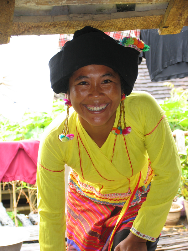 婦女的衣裙與傣族相似,上穿緊身短衣,頭頂挽髻,用頭巾纏頭,喜歡戴大耳環(huán)、銀手鐲等裝飾。姑娘愛戴野花或自編的彩花,將雙頰染紅。一般,女子上著左右兩祚斜襟窄袖黑色小褂,小褂為圓領(lǐng)、緊腰、寬擺,短及臀部,在左肋下拴線打結(jié),已婚婦女用黑色布料,未婚姑娘喜淺藍(lán)色或白色。里衫為無(wú)袖貼身夾衫,下穿兩條筒裙,內(nèi)裙為白色,外裙有兩色,臀部以上為紅色橫條,腿下為綠色或黑色,用布條或花邊鑲飾。未婚婦女用黑或藍(lán)布包頭;已婚婦女梳發(fā)髻,插銀簪,頂端鑲3顆棱形玻璃珠,下系銀鏈,纏包頭。婦女戴銀耳環(huán)、項(xiàng)圈、手鐲等飾品。