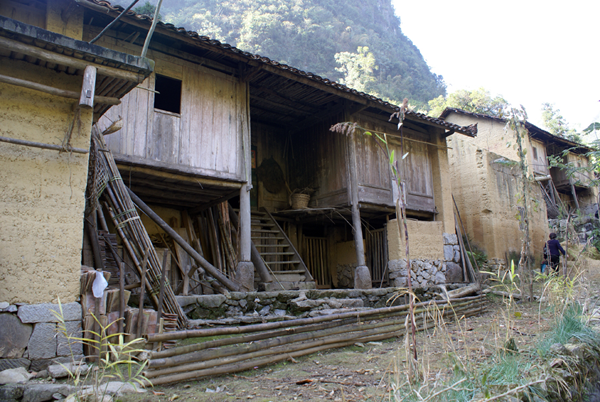 干欄石屋(亦稱干欄石樓)為進(jìn)入20世紀(jì)后多數(shù)農(nóng)民的住屋,是凹形矮腳石木結(jié)構(gòu)干欄式,因墻基用石頭砌成而得名。上層住人,下層圈養(yǎng)牲畜及堆放農(nóng)具和柴草,可以防潮。整棟房為石基、泥墻、木柱、瓦頂。每棟以用銜條數(shù)和間數(shù)多少區(qū)別大小。從屋頂?shù)轿蓍軆蛇?,?3根銜條的叫檐十三,用15根的叫檐十五,以此類推。檐十三屋內(nèi)較窄,不便擺放家具雜物;檐十九較寬敞,但屋檐低矮,室內(nèi)陰暗。以檐十七居多,屋里寬敞,通風(fēng)采光也良好。多為三、五、七、九間,大門(mén)居中,兩邊對(duì)稱。