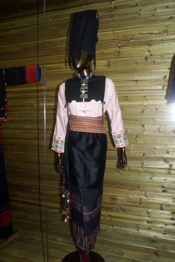 男子穿對(duì)襟上衣,下著黑褲,斜背“筒帕”,喜歡在胸前戴朵紅絲線結(jié)成的菊花。未婚男子戴白包頭,已婚男子戴藏青色包頭,青壯年在腦后留一尺多長(zhǎng)的包布,有隨身佩帶刀的習(xí)俗,其中“戶撒刀”最為有名。