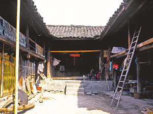廚房大都在左間,地中間橫砌土臺鍋灶,上面是兩口大鐵鍋??亢髩κ谴毒摺⒉途?,前面是石碓,平時搗豬飼料,節(jié)日搗粑粑,用石碓搗的辣椒面也格外好吃。右間大都是家長的居室,只放木床。兩側廂房與主房分離,木板梯上下。一側下層是豬圈、牛欄,上邊存干草;另一側下面堆放糧食、燒柴、摩托車,上層是未婚子女的臥室,有廊道、腰欄。院落小的,在主房對面設牛欄,砌土坯墻圍成獨立的合院。