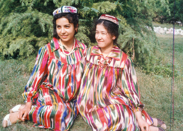 烏孜別克族女性喜愛穿連衣花裙,開領(lǐng),寬大多褶,不束腰帶。上衣比較短,只及大腿部,無領(lǐng)、無袖、對襟,下擺的正中和正面兩邊都開衩,形成兩片寬帶。襟和寬帶的邊都繡花。出門時還要穿斗篷、蒙面紗,從頭到腳都不能外露。