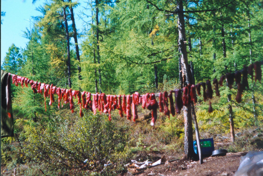 鄂溫克族人的飲食根據(jù)居住地的自然環(huán)境有所不同。林區(qū)的鄂溫克族完全以肉類(lèi)作為日常生活的主食,主食包括罕達(dá)犴肉、鹿肉、熊肉、野豬肉、狍子肉、灰鼠肉,飛龍、野雞、烏雞、魚(yú)類(lèi)等,其中鹿、狍子的肝、腎一般都生食,其他部分則要煮食。牧區(qū)的鄂溫克族以乳類(lèi)和乳制品為主食,其中比較特別的食物是奶茶。