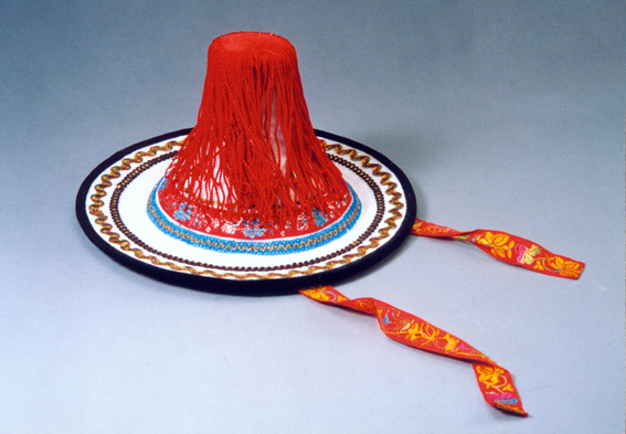 帽子是姑娘和已婚婦女的區(qū)別標(biāo)志。姑娘不戴帽子,前額戴“沙日達(dá)什戈”。這是一條寬約三寸長(zhǎng)約一尺,下邊緣用紅色或白色珊瑚小珠穿縫許多珠穗的紅色布帶。已婚婦女身穿高領(lǐng)偏襟長(zhǎng)袍,一般由綢、緞、布、褐、皮料縫制。衣領(lǐng)高齊耳根,袍子一般以綠、藍(lán)色為主,但也有深紅、紫紅等顏色。袍子下擺兩邊開衩,衣袖口至肘部用各色織錦緞、彩綢、彩緞花邊一圈圈縫綴裝飾。腰系腰帶(裕固族也叫“胡兒”,即系腰),主要是桃紅色或綠色,長(zhǎng)袍上面罩一件高領(lǐng)偏襟坎肩,但也有無領(lǐng)偏襟坎肩。