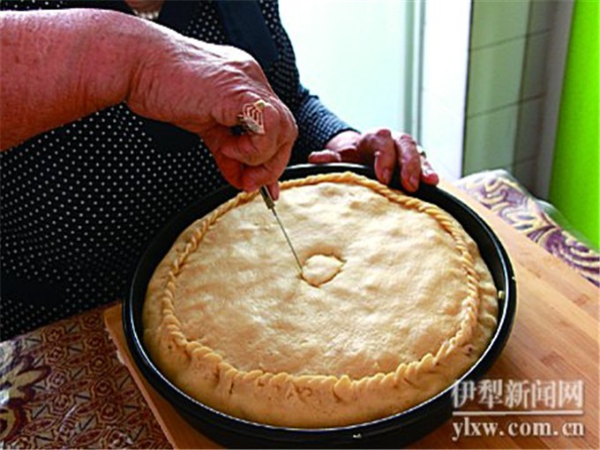 這段時(shí)間,就可以拌餡了。買斯胡旦向先前放在一旁的羊肉、土豆和洋蔥中加入一些鹽和黑胡椒粉,攪拌均勻。肉與黑胡椒粉相融的辛辣香味已經(jīng)開始漫溢。接著繼續(xù)揉面。將醒好的面分成大小兩塊。大的做底,小的做頂。待大小兩塊面都搟成圓形薄餅狀后,就將底子鋪在托盤底部,多出的部分緊緊扣合托盤邊緣。然后倒入餡料,鋪平,加蓋,將上下兩層面餅悉心捏合成好看的花邊。最后,在面餅中間掏個(gè)洞,切下的面團(tuán)做成小壺蓋,再原位放到上面。壺蓋的作用在于等面餅烤至表層泛紅時(shí),將其端出,取下壺蓋,加些許開水進(jìn)去?!鞍萘形骱芎瘢锩娴牧虾芏?,要是水干了,就不容易熟。”買斯胡旦解釋。做完這一切,就可以將托盤放進(jìn)烤箱了,調(diào)整烤箱至200℃的火力就夠,這樣,經(jīng)過2個(gè)小時(shí)的烘烤,外酥內(nèi)軟,香而不焦的拜列西就烤好了。