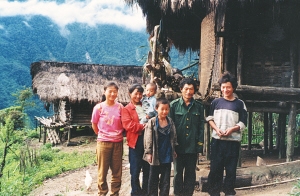 取走竹箭背上弩弓向巴坡返回,一座竹樓里傳出一群孩子的聲音。進(jìn)了屋,大人不在,主人的孩子見到我趕忙攏火燒水,屋里還有鄰家的幾個孩子。我對孩子們說,走哇,到外面射箭去。