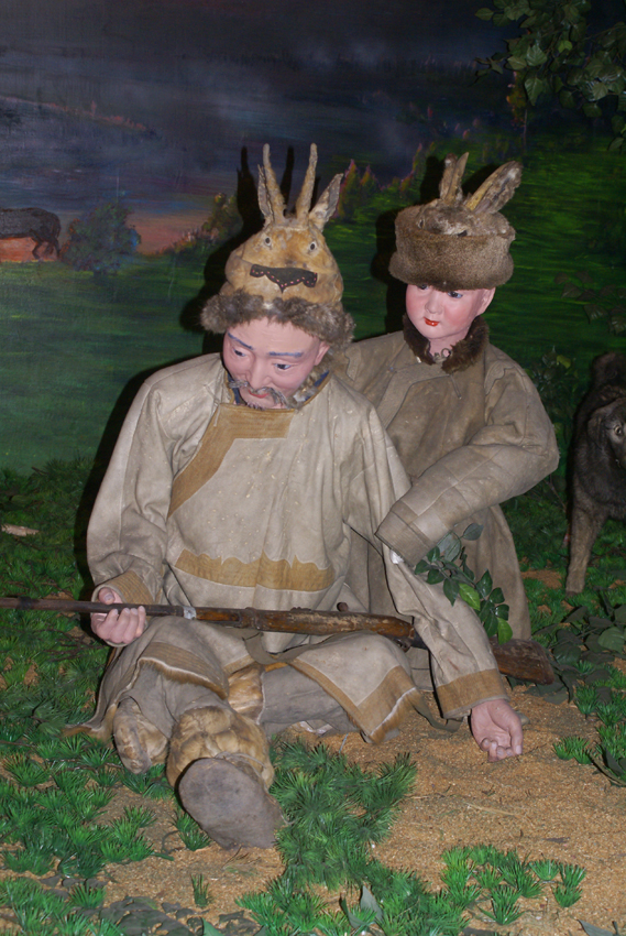 狩獵經(jīng)濟(jì)在鄂倫春族社會(huì)中維持了幾千年,一人一匹獵馬一桿槍,再加上幾條獵狗和一片獵場(chǎng),幾乎就是鄂倫春族的全部生產(chǎn)力。而槍支的傳入也不過才300多年的歷史,在此之前使用石塊和木棒狩獵,后來發(fā)明了扎槍和弓箭,與外界幾乎隔絕,純粹的食獸肉、衣獸皮。鄂倫春族最早使用的獵槍是被稱做“俄羅斯鳥槍”的火槍,這是清朝的察邊官吏、外民族及俄國(guó)商人交換給他們的。有火繩槍、火鐮槍和泡子槍三種,都是從槍筒裝入火藥或鉛彈,只是引爆方式不同。民國(guó)以后陸續(xù)傳入俄國(guó)造的連珠式和“三八”式、“七九”式等現(xiàn)代步槍。槍支的傳入,使鄂倫春人有了剩余產(chǎn)品,于是出現(xiàn)了交換經(jīng)濟(jì)。每年五月的“楚勒罕”集會(huì)時(shí),鄂倫春、鄂溫克、達(dá)斡爾等狩獵民族要向清廷貢貂,經(jīng)朝廷官員檢驗(yàn),不合格者可以在集會(huì)上進(jìn)行互市。此時(shí),他們也帶一些其他的獵產(chǎn)品及手工藝品進(jìn)行交換。由于鄂倫春人所貢貂皮質(zhì)量最好,故朝廷對(duì)他們采取了特別的納貂辦法:每年派一名專職人員到鄂倫春地區(qū)代表官府征收貂皮、發(fā)放賞賜。這些專職人員被稱為“諳達(dá)”,他們代表官府征收貂皮的同時(shí),也自帶一些糧食、布匹和其他生產(chǎn)、生活用品與鄂倫春人進(jìn)行私下交換。后來,“諳達(dá)”變成了泛指進(jìn)山進(jìn)行獵產(chǎn)品收購(gòu)生意的所有商人。“諳達(dá)”與鄂倫春人進(jìn)行交換時(shí)從不計(jì)價(jià),而是以“馬馱”為計(jì)量單位,雙方以同樣一馬馱的物品進(jìn)行互換,或者采取包干制的辦法,一個(gè)“諳達(dá)”固定幾個(gè)包攬戶,按期供給他們生產(chǎn)和生活必需品,包攬戶將所有的剩余產(chǎn)品交于“諳達(dá)”。隨著貨幣經(jīng)濟(jì)的發(fā)展,清末時(shí)期,鄂倫春族周邊地區(qū)出現(xiàn)了眾多商號(hào)商鋪,這些商號(hào)(鋪)的老板被稱為“老客”,他們同鄂倫春人進(jìn)行計(jì)價(jià)交換。同時(shí)還出現(xiàn)了一些進(jìn)行計(jì)價(jià)交換的行商,被稱為“跑老客”。鄂倫春人雖然受到“諳達(dá)”、老客和跑老客的瘋狂欺詐和層層盤剝,但在與他們的交換中,卻自覺或不自覺地打開了封閉的自然經(jīng)濟(jì)大門,朝著商品經(jīng)濟(jì)邁進(jìn)了一步(鄂倫春博物館展覽攝影:劉軍)。