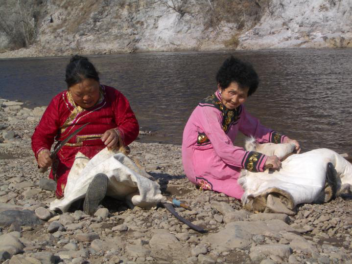 鄂倫春人過去在家庭公社“烏力鄰”里,同生產(chǎn)共消費(fèi),在當(dāng)時(shí)生產(chǎn)力十分低下的情況下,憑著扎槍和弓箭,單個(gè)人很難獲得能夠滿足衣食需要的獵物,必須要有“烏力鄰”全體成員的通力合作,才能戰(zhàn)勝兇猛和龐大的野獸,所以,在“塔坦達(dá)”領(lǐng)導(dǎo)下的集體狩獵是當(dāng)時(shí)最主要的勞動(dòng)形式。隨著生產(chǎn)力的不斷發(fā)展和個(gè)體小家庭的大量流動(dòng),不僅社會(huì)組織“烏力鄰”由原來血緣性的家庭公社演變?yōu)榈鼐壭缘牡赜蚬纾瑒趧?dòng)組織也隨之發(fā)生了極大的變化。集體狩獵已不再是“烏力鄰”傾巢出動(dòng),而是由幾個(gè)小家庭的成員自愿結(jié)合成“安嘎”來進(jìn)行。同時(shí)還出現(xiàn)了集體和個(gè)人等多種勞動(dòng)形式。狩獵也不再單純是為了滿足衣食的需要,剩余獵物可以拿去交換,獵產(chǎn)品已趨于商品化。故此時(shí)一些珍貴的細(xì)毛皮張和藥用價(jià)值較高的獸類,成了鄂倫春人主要的狩獵目標(biāo)。這樣就形成了一年中的四個(gè)狩獵旺季,即:農(nóng)歷正月至2月是“鹿胎期”;4月至6月是“鹿茸期”;9月至落雪為“叫鹿尾期”;落雪后至來年開春是“打皮子期”。大概是源于原始的圍獵,鄂倫春人把狩獵叫“打圍”,而這四個(gè)狩獵旺季就叫“紅圍期”。“紅圍期”除“叫鹿尾期”外,都組織“安嘎”集體出獵?!鞍哺隆笔且环N臨時(shí)性的狩獵組織,狩獵旺季將臨時(shí),由一人發(fā)起,串聯(lián)幾位親朋好友或志趣相投的人組成一個(gè)“安嘎”,待獵期結(jié)束,“安嘎”自行解散,下次出獵時(shí)再重新組合,因此其成員并不是固定的(圖為熟化狍皮,吳雅芝攝影)。