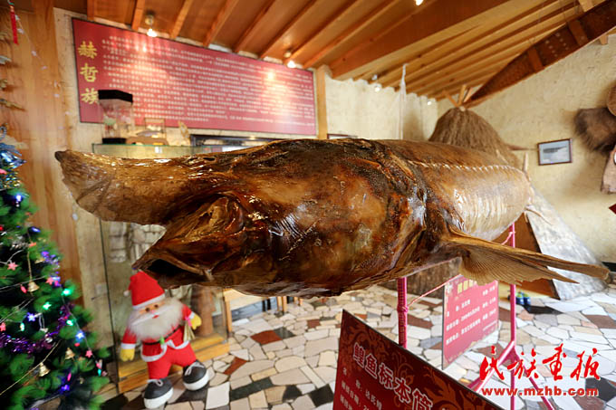 赫哲人把餐廳開到了京城,成為向外界展示赫哲族文化的窗口。圖為赫哲族餐廳內(nèi)57歲的大鰉魚標(biāo)本,體長(zhǎng)2.5米,重達(dá)286斤(陳濤 攝影)