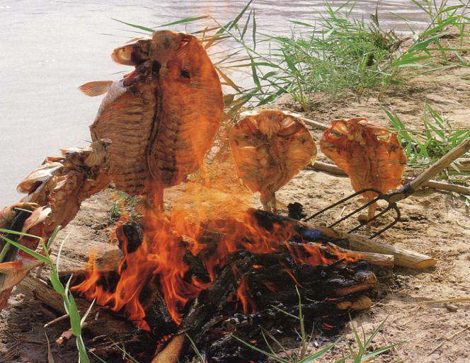 赫哲族居住的三江流域,河流縱橫交錯(cuò),群山環(huán)繞,蘊(yùn)藏著極為豐富的漁獵資源。長期以漁獵為生的赫哲族人民,在征服自然、改造自然的歷史發(fā)展過程中形成了具有濃郁民族特色和地域特色的傳統(tǒng)飲食文化。其傳統(tǒng)飲食以漁獵產(chǎn)品為主,魚干獸肉,家家堆積為糧。這與農(nóng)牧民族相比,別具特色。