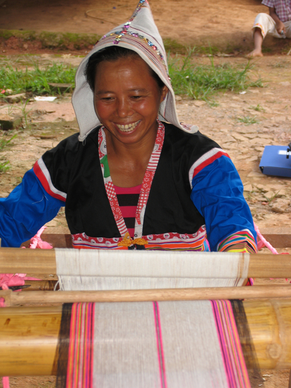 基諾族豎線花紋的衣料是獨(dú)具民族特色的基諾族織錦“砍刀布”。