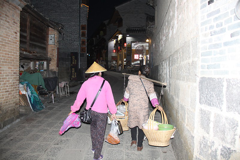 晚上7點(diǎn)多鐘,一群在小河里撲騰了一天的鴨子排著隊(duì)憨態(tài)可掬地回到寸家灣巷口,忙碌一天的人們也開(kāi)始回家。我正擔(dān)心晚上約定的采訪找不到地方,卻在圖書(shū)館旁邊的小巷里碰到了收工回家的姜聰留。她今天的松花糕賣(mài)了一板半,收入100多元。同行的一個(gè)姐妹幫她挑著擔(dān)子,姜聰留自己提著袋子和板凳,一路無(wú)語(yǔ)。臨近家門(mén)的路口,姜聰留從姐妹肩上接過(guò)擔(dān)子,眼神默契相視后,各自回家——這就是她們的生活。晚飯姜聰留到丈夫的大哥家吃土鍋?zhàn)樱瑑杉业脑鹤又桓粢粔?,我也跟著進(jìn)了大哥江宗良的家門(mén)。