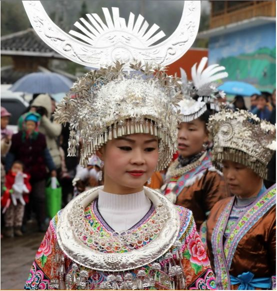 苗族頭飾主要是以銀飾為主。苗族女孩從學(xué)會(huì)走路開始,父母就會(huì)給女兒制作一套苗族民族盛裝和頭飾,苗族女孩一般6歲左右就可以參加每年的民族盛會(huì),并且從小學(xué)習(xí)化妝技術(shù)。苗族的盛會(huì)主要集中在春節(jié)后,也叫坡會(huì),就是山坡上的聚會(huì),這一天苗族姑娘就會(huì)穿上珍藏已久的民族盛裝,戴上頭飾,把自己打扮的漂漂亮亮,參加蘆笙踩堂舞,展示自己的美麗一面。