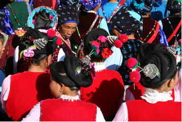 以大理市為主要代表的洱濱區(qū)白族服飾。如周城、喜洲、挖色等白族服飾,他們世代伴水而居,生活環(huán)境十分優(yōu)越,服飾給人一種清新明快的感覺。在很大程度上折射出這種環(huán)境的優(yōu)越性,周城村白族男服飾過去的穿著較為復(fù)雜,纏白布包頭,上衣穿立領(lǐng)對襟布紐衣,俗稱“三滴水”,最里的一件穿白色、中間一件穿藍(lán)色、最外一件穿黑色或是藏青色的外衣,三件衣服都是敞開著,露出內(nèi)穿的兜肚,外穿一件麂皮或山羊皮的領(lǐng)褂,下穿白或藍(lán)色大襠褲,腳穿布底剪口鞋。肩掛繡花掛包。而現(xiàn)在的男裝基本與漢族相同,平時需要穿戴的民族服裝也是改良過較為簡潔的男裝,只有在重大節(jié)日的時候才能看到傳統(tǒng)的著裝風(fēng)采。而女裝的穿戴至今還保持得較為完整,以白、藍(lán)兩色為主,沿承了白族崇尚白色的傳統(tǒng)特點(diǎn),上身穿白色緊袖裳,外套紅或藍(lán)色右衽領(lǐng)褂,在領(lǐng)褂的紐扣上掛三須或五須銀鏈,銀鏈上綴掛件,有銀質(zhì)的針筒、魚、牙簽、耳勺。手戴金、銀或玉手鐲、戒指。耳戴金、銀耳墜。手袖上套滾邊的大袖小袖,并在袖上鑲各式花邊。腰系繡花短圍裙或系凈白色底外鑲一圈黑色邊的素面短圍腰。下穿白或藍(lán)色滾邊長褲,褲腿邊鑲寬窄花邊,花邊上面繡各類花卉圖案。腳穿繡花尖鞋,又名“白姐鞋”(“柏姐鞋”),鞋面為紅、粉、綠、黑等色,繡有艷麗的花紋。頭飾和過去的頭飾相比較從美術(shù)的角度上看要美得多,特別是姑娘的頭飾,過去傳統(tǒng)頭飾一般喜戴魚尾帽,還有我們在電影《五朵金花》中所看到過的姑娘頭飾,而今姑娘的頭飾讓人一看就聯(lián)想到大理的“風(fēng)花雪月”四大美景。頭戴色彩鮮艷的繡花頭巾,繡花頭帕上端精心梳理出茂密雪白的絨毛,形象的表現(xiàn)了蒼山頂上的皚皚白雪,將發(fā)辮盤繡花頭帕外,纏以大紅絨線,形如滿月,一側(cè)垂下雪白的纓穗飄飄灑灑,象征著終年吹拂的下關(guān)風(fēng)。整套服飾在很大程度上折射出這種環(huán)境的優(yōu)越性,如色彩搭配對比鮮明,簡潔明快,挑花精美,毫無細(xì)碎之感,裝飾繁而不俗等。