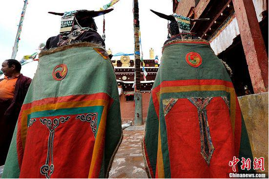 盡管歷史悠久,但它并沒有隨著時光的流逝和時代的變遷而被束之高閣,實際上,即便是今天,這些服飾仍然是當?shù)刂匾淖诮袒顒又斜夭豢缮俚膬?nèi)容,在科迦寺每年藏歷1月12日大譯師仁青桑布建成108座殿堂和寺廟的慶功紀念日上,科迦村有這套服飾的7戶家庭的婦女都要穿上這套服飾在科迦寺僧人跳神舞的間隙表演宣舞。