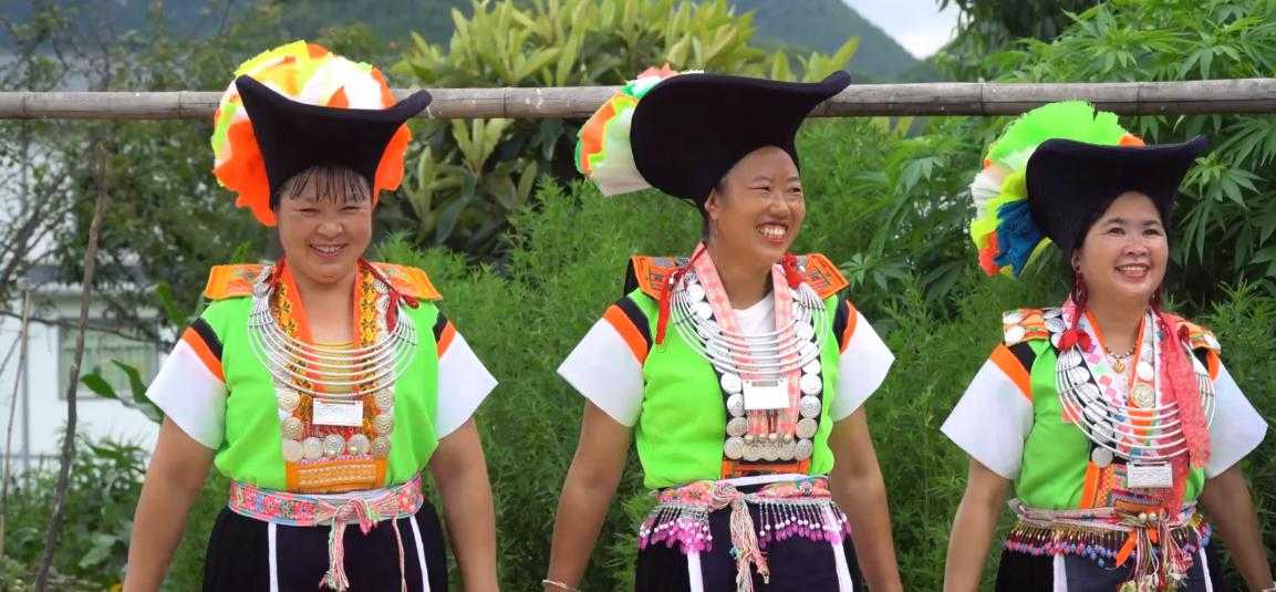 五星村苗族女性服飾顏色亮麗,做工精細。女子頭戴黑色百褶帽,百褶帽形似一只船,在其尾部還裝飾有用絲巾制作而成的花朵。上身則多以黃綠色打底的對襟短衣,對襟處繡有花紋圖案作為描邊,對襟上裝有銀飾圓牌。女子胸前還大多佩戴銀項圈,身后則穿戴背牌。背牌做工極為精細,刺繡圖案豐富。圖案多以幾何和花草為主,背牌上部裝飾有兩排對稱的銀牌,左右也裝飾有對稱的銀鎖。背牌中部是一個倒三角銀飾,銀飾上雕刻有蝴蝶圖案。女性服飾下裳主要分為三個部分,底部為黑色打底長褲,中層為黑色打底的百褶裙,上層則為黑色打底的圍腰。圍腰底部繡有花紋圖案裝飾,圖案內容多以花草為主。腰部系有腰帶,腰帶上刺有花紋圖案且顏色較為鮮艷。女性服飾身后還垂有四條絲帶,絲帶上也繡有大面積的花紋圖案,服飾整體充滿民族氣息。