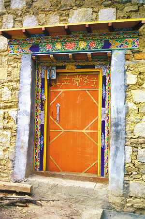 房屋大都是3層,上層存放干草和秸桿,下層關(guān)養(yǎng)牲畜,中間一層是居室。居室用木板隔間,里間較小是已婚子女住的,外間寬敞,是多功能堂屋。臨窗處設(shè)火塘,以利排煙,是家庭生活中心和待客之處?;鹛辽霞苤T大的鐵三角架,上面是六七厘米寬的鐵板圈,擦得錚亮,能烤制食物。墻角處供奉佛像,擺放領(lǐng)袖像。房門安設(shè)木鎖,用十幾厘米的木鑰匙開(kāi)啟,都是由硬木刻制,光滑耐用。