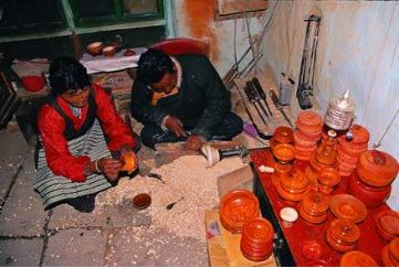 木碗的來源,一是西藏自己生產(chǎn)的,還有一種是云南迪慶生產(chǎn)的,都是從西藏的市場上交換或購買的。西藏林芝地區(qū)的朗縣、察隅,山南地區(qū)的加查、隆子、錯那,阿里地區(qū)的噶爾等地均產(chǎn)木碗。其中尤以錯那生產(chǎn)的“察牙”木碗和噶爾生產(chǎn)的“堆旭”木碗最負(fù)盛名。以上木碗的原料選擇樹根或樹瘤車制而成,選料之講究,做工之精細(xì),使好木碗的花紋各異,或磷火紋,或豬鬃紋,或貓頭鷹眼紋,這些木碗都很名貴,與普通木碗之間的價(jià)格也很懸殊,一個(gè)上等木碗價(jià)值10頭牦牛,一般人家是不敢問津的,但也盡量想方設(shè)法弄個(gè)像樣的,以慰平生。