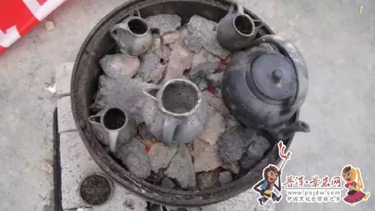 彝家糊米罐罐香茶烤罐要肚大口小,大小適中,茶具為土陶和紫砂制品為主。泡茶取無量山泉水,主要工序是用銅壺將水燒開,先將上好的糯米煎烤至黃,再將取于哀牢無量山的曬青白牙口茶放入抖烤??静钑r要求“烤關(guān)百抖”,茶葉泛香糯米焦黃,糊米和茶葉烤好后,即沖入少量沸水,讓水自動沖除罐口浮沫,放入小片刨開的鮮姜,再加入開水煮一分鐘,即可入杯,奉給客人飲用。