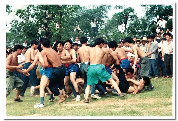 待賀節(jié)隊(duì)回到主會場,花炮節(jié)正式開始,首先是舞獅表演,接著蘆笙、卡羅舞表演,斗馬、斗鳥以及賽馬等活動各自展開。這些活動告一段落后,最精彩的節(jié)目——搶花炮開始了,人們像潮水般涌向主席臺前,圍成一個幾十個平方米的空地作搶花炮場地。搶花炮分一、二、三等,搶三次,得勝者,抬著漂亮的花炮頭及獎品興高采烈地回村了。