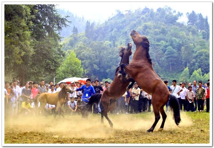 斗馬節(jié)這一天,縣城笙歌震天,鐵炮、粉槍齊鳴。穿著節(jié)日盛裝的各族群眾興高采烈,跳起歡快的蘆笙踩堂舞。這時(shí)精神抖擻的苗家馬主,牽著各自的馬匹,從四面八方云集斗馬場。先由馬主拈鬮分組初賽,兩兩相斗,出線者參加復(fù)賽和決賽,決出最后名次。對(duì)獲勝者評(píng)出一、二、三名,給戰(zhàn)馬披紅掛彩。