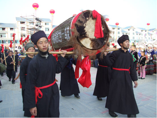 第6天(申日):下午兩三點(diǎn)鐘,保管銅鼓的寨老等人,燒香化紙,燃放鞭炮,用魚、肉、酒等祭鼓后,先由寨老家人踩幾圈銅鼓,然后全寨男女老少及來客(主要為女青年)跟著踩。這天,人人穿著節(jié)日盛裝,在蘆笙的伴奏下,踏著鼓點(diǎn),圍圈跳蘆笙銅鼓舞。晚夜,本寨和外寨未婚男女青年在河灘等地“游方”,對(duì)唱情歌,尋覓伴侶。每天晚上的“游方”活動(dòng)持續(xù)到第10天(子日)才結(jié)束,這時(shí)外寨的男女青年才依依不舍離去。