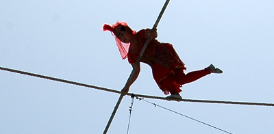 “達瓦孜”既是少數(shù)民族傳統(tǒng)體育運動表演項目,也是節(jié)日里娛樂活動,它有雜技和體育的雙重特點?!斑_瓦孜”高空走繩表演十分壯觀,在空曠的場地上,中間聳立三十多米高的立桿,頂處扎一牌樓上掛彩旗。牌樓橫桿兩端有表演用的吊杠和吊環(huán)。表演技能的繩索長八十多米。表演者手持長約6米的平衡桿,不系保險帶,在繩索上作前后走動、盤腿端坐、蒙眼行走,甚至腳踩碟子、飛身跳躍等一系列驚心動魄的動作。經(jīng)過不斷實踐和發(fā)展,“達瓦孜”表演技巧有了新突破,在濃郁民族風味維吾爾族民間樂曲伴奏中,表演者輕松自如地在、高空繩索上踏著節(jié)拍跳舞歌唱,并且敏捷地變換著高難動作。