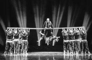 在靜謐的夜空下,首先映入觀眾眼簾的是群舞演員在舞臺(tái)中央,用身體構(gòu)建的人字形“情人房”。房?jī)?nèi)的瑤族姑娘正在小憩,或許是被屋外的動(dòng)靜驚醒,她推門(mén)出外察看,重重的門(mén)軸聲劃破了夜的寂靜,原來(lái)是愛(ài)慕者正攀在一根竹竿上向自己示愛(ài)?!盁o(wú)竹不成瑤”,舞蹈伊始,最核心的道具——一根長(zhǎng)約8米、杯口粗的竹竿就出現(xiàn)了。借助竹竿,群舞演員通過(guò)造型組合及隊(duì)形變換,不斷再現(xiàn)生活場(chǎng)景:山坡上、小橋上、屋檐下、窗欞邊……情隨景遷、情景交融,生活圖景和人物情緒巧妙地融合在一起,營(yíng)造出一種別樣的意境,極大地引發(fā)了觀眾的聯(lián)想。