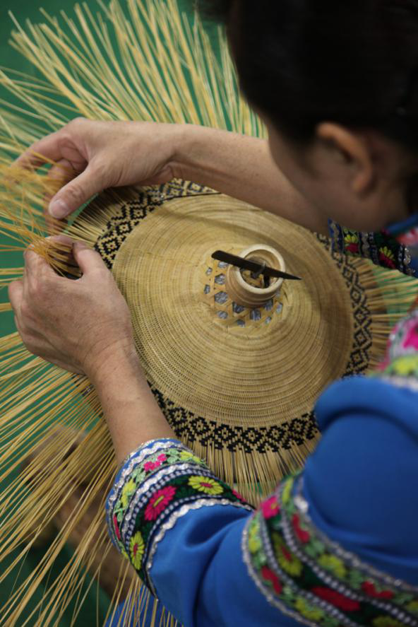 花竹帽是一種形似斗笠、花紋美觀的傳統(tǒng)竹編手工藝品。它以當(dāng)?shù)靥禺a(chǎn)的金竹和墨竹為編織材料。