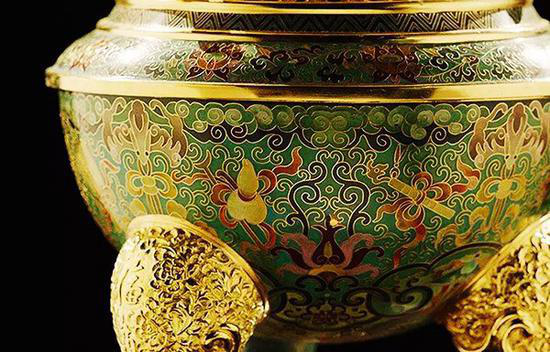 此時的景泰藍不僅繼承了明代豪華、古典、雅致的民族風格,而且鍍金技術更為發(fā)達,器物表面多飾以珍貴寶石,鍍金厚重光亮,寶石燦爛奪目,二者相得益彰,充分體現(xiàn)了皇家的雍容氣派。