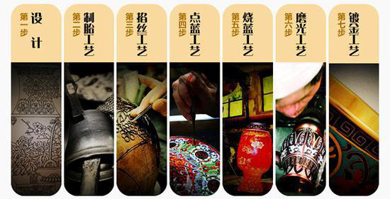 一件景泰藍成品需要歷經(jīng)設計、制胎、掐絲、點藍、燒藍、磨光、鍍金七大步驟,近百道工序,十幾個工匠三個月的時間純手工方能完成。景泰藍既運用了青銅工藝,又吸收了瓷器工藝,同時大量引進傳統(tǒng)繪畫和雕刻技藝,是集冶金、鑄造、繪畫、窯業(yè)、雕、鏨、錘等多種工藝為一體的復合性工藝過程,堪稱集中國傳統(tǒng)工藝之大成,因而自古便有“一件景泰藍,十箱官窯器”之說。