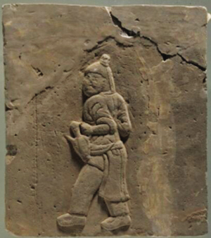 長30厘米,寬26.8厘米,厚5厘米。畫面中央為一男仆手持壺作行進狀。男仆頭戴幘巾,身著翻領(lǐng)長袍,雙袖卷起至肘部,前襟卷起掖于腰帶上,左手持有蓋長柄執(zhí)壺,穿長褲,足穿靸鞋,上身前傾,似乎聽到主人的呼喚,正在匆忙前去斟酒服侍,整體畫面形象生動。