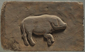 長30厘米,寬18.5厘米,厚5厘米,呈長方形。畫面中央為一只側(cè)身的小豬。小豬形象逼真,一只前踢抬起,體態(tài)肥碩,造型可愛,刻畫精細。