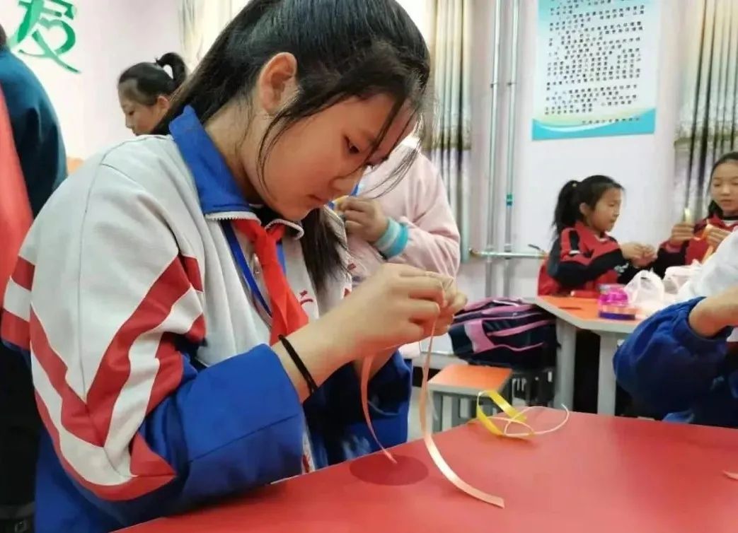 葛玉英說:”芨芨草手工編織品主要有簍、筐、盒、盤、茶墊、時(shí)尚包等生活用品,色彩以白、藍(lán)為主,圖案以白云紋、曲字紋為主,以針繡法結(jié)合草編中的平編、絞編、編花、纏邊、擰編等技法進(jìn)行編織。在實(shí)際教學(xué)中,為了方便,我用彩帶代替芨芨草,讓芨芨草編織技藝在孩子們的濃厚興趣中得到傳承,既提高了學(xué)生的動(dòng)手能力,也提升了學(xué)生的審美思維和審美能力,同時(shí)增強(qiáng)了學(xué)生對(duì)本土文化的自豪感和自信力。”