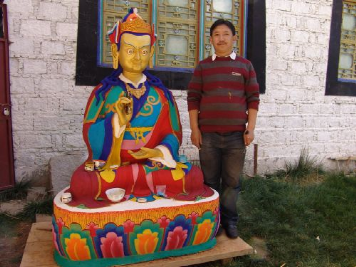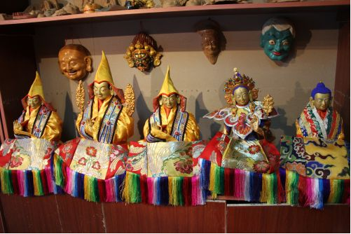 在泥塑技藝中除了面具外,佛像也是不計(jì)其數(shù),從形態(tài)上可分為喜相、怒相兩大類。“手工藝人在制作泥塑佛像時(shí)一定要按照標(biāo)準(zhǔn)進(jìn)行,就像畫唐卡一樣,這些藝人要把《造像度量經(jīng)》牢記在心里,在制作時(shí)要不停默背佛像的尺寸大小,所以你看這些已經(jīng)制作好的泥塑佛像在輪廓上都是固定的,只是在一些裝飾品上有所不同。”普布次仁一邊指著身旁的泥塑佛像一邊講解道。
