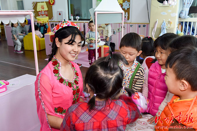 自2014年首場“民族風吹進幼兒園,愛心曲唱暖身邊人”公益活動獲得積極反響后,幼兒園黨支部、工會、團支部牽手園區(qū)民族團結共建單位,走出校園、貼近社區(qū),以愛心義賣、義拍、定向捐助等方式為園區(qū)少數(shù)民族困難家庭送去關懷。在近幾年的園區(qū)民族工作實踐中,天恒名都幼兒園的“家、校、社、企”聯(lián)動模式不斷發(fā)展創(chuàng)新,培育孵化出少數(shù)民族(幼教)實習點、少數(shù)民族志愿者服務隊等形式的實習模式。2013年至今,幼兒園已為上海市群益職業(yè)技術學校的“新疆班”學生210人次提供了實習崗位。