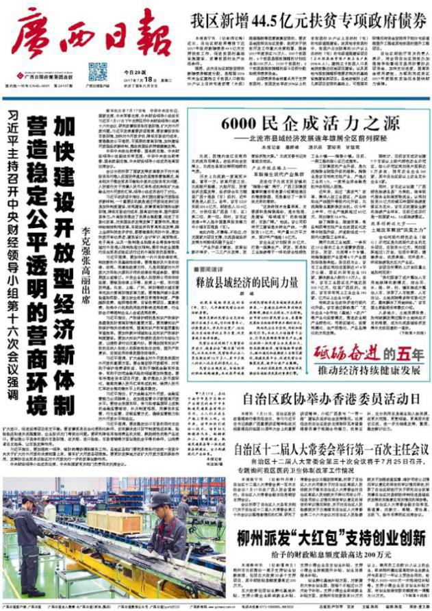 《廣西日報》立足廣西、面向全國,國內(nèi)外公開發(fā)行。目前,星期一至星期五每日出版對開12版,星期六、星期日出版對開8版,彩色印刷,是廣西第一大綜合性日報。新聞信息容量大,專刊副刊多樣,適應(yīng)多層次讀者需要,集指導(dǎo)性、權(quán)威性、科學(xué)性、服務(wù)性、實(shí)用性、知識性和趣味性為一體。