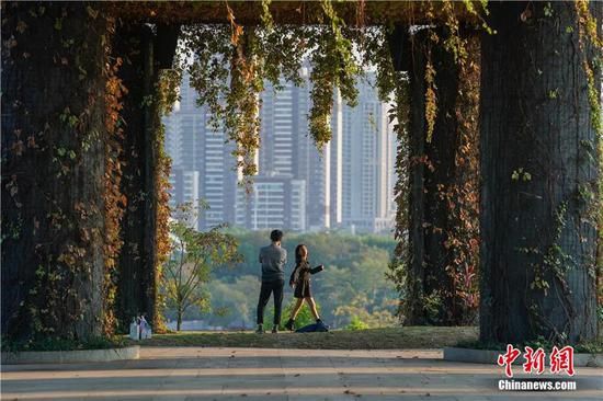 2021年11月30日,廣西南寧五象湖公園,市民趁著好天氣前來(lái)欣賞都市美景。中新社記者 陳冠言 攝