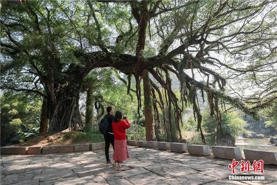2020年10月,游客在廣西昭平縣的黃姚古鎮(zhèn)內(nèi)參觀(guān)古榕樹(shù)。中新社記者 賈天勇 攝