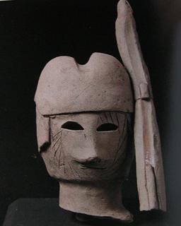 埴輪,為日本特有的器物。埴輪放置在古墳封土表面,即為前方后圓墳中“方”的地方。埴輪分為筒形埴輪,來源于陶器;還有形象埴輪,細(xì)分為器物和人物。埴輪來源于中國古代墓室中陪葬的陶俑,或古代帝陵神道上的石獸石人。某些埴輪人物有文面,并填墨(圖十六),推測當(dāng)時(shí)的日本出現(xiàn)了文面現(xiàn)象。