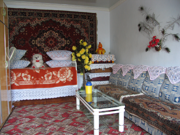 木刻楞房的室內(nèi)結(jié)構(gòu)一般有客廳、臥室、廚房和儲(chǔ)藏室四部分構(gòu)成,房屋的整體結(jié)構(gòu)呈四方形,建造有傾斜度較高的屋頂,利于雨雪不會(huì)覆蓋在屋頂,從而造成屋頂承重過(guò)高而發(fā)生坍塌。此外,俄羅斯族人一般都會(huì)選用紅色、藍(lán)色或者綠色的鐵皮將屋頂精心包裹一番。這不僅可以起到很好的防風(fēng)御寒、防止雨雪滴漏進(jìn)室內(nèi)的效果,而且也使木刻楞房色彩十分和諧艷麗。房屋的正門之前一般會(huì)建造寬闊的門庭和圍廊,門內(nèi)有過(guò)道,過(guò)道兩旁是臥室和客廳。室內(nèi)的墻角有土坯壘砌的火墻。有的人家是大型壁爐,外包一層鐵皮,鐵皮上抹一層黑油,俗稱“毛爐”,是很好的取暖設(shè)備。室內(nèi)陳設(shè)比較講究,臥室擺放著木床或鐵床,鐵床欄桿雕有花草圖像,給人以古雅之感。木刻楞房室內(nèi)一般會(huì)在地面鋪上木地板,俄羅斯族人們也十分喜愛(ài)在家中鋪設(shè)飾有各類花紋圖案的地毯。