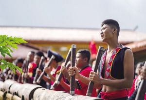 云南省滄源縣班洪鄉(xiāng)班洪村的佤族群眾身穿節(jié)日盛裝,敲響佤族木鼓。新華社記者 江文耀攝