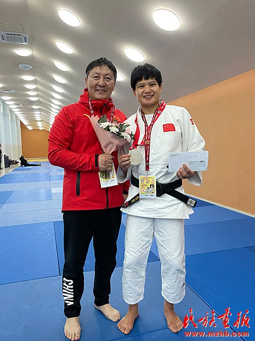 烏日根桑格(左)隨國家柔道隊參加 2021年世界柔道大滿貫比賽。圖為與國際級運(yùn)動健將、國家柔道隊隊員楊俊霞合影留念。