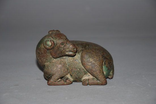 銅羊做蹲臥式,盤角,回首,兩眼凝視,似乎聞聲將起,體型肥碩,神態(tài)溫馴、生動活潑,栩栩如生。在鑄造上工匠利用傳統(tǒng)的錯金銀工藝,用金絲銀線鑲嵌全身,凸顯出羊首輪廓和纖細卷曲的絨毛,金光銀彩交相輝映,更顯得生氣盎然。兩漢時期不但繼承了先秦時代已有的錯金銀技術(shù),而且還有一定的創(chuàng)新,工藝更為精湛。